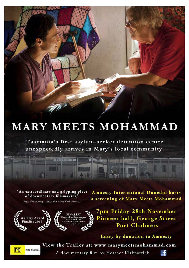 My local Amnesty International group in Dunedin will be screening Mary Meets Mohammed at the Pioneer Hall in Port Chalmers on Friday 28 November at 7pm. This is a heart-warming movie made by AI Australia about the friendship that develops between an asylum seeker from the Middle East and a Tasmanian woman who initially thinks that such people should be ‘sent back to where they came from’. A gold coin donation for entry will go to AI Australia to support our own Mary Morwood who has committed herself to a sponsored walk in Australia, raising money to support asylum seekers in detention, and the rights of Australian Aboriginal people. There will be refreshments available after the film. All welcome.