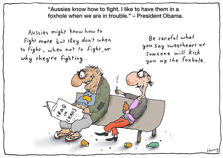 Leunig on Aussies, fighting, President Obama, and being kicked up the foxhole