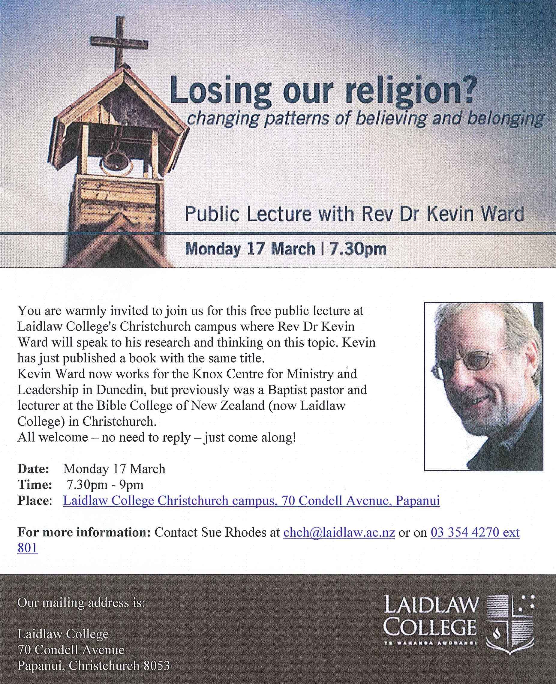 My colleague Kevin Ward is giving a pubic lecture next week on the subject of his recently-published book Losing Our Religion?: Changing Patterns of Believing and Belonging in Secular Western Societies. If you’re within a penalty kick of Christchurch you may want to meander along. Kevin knows his stuff.