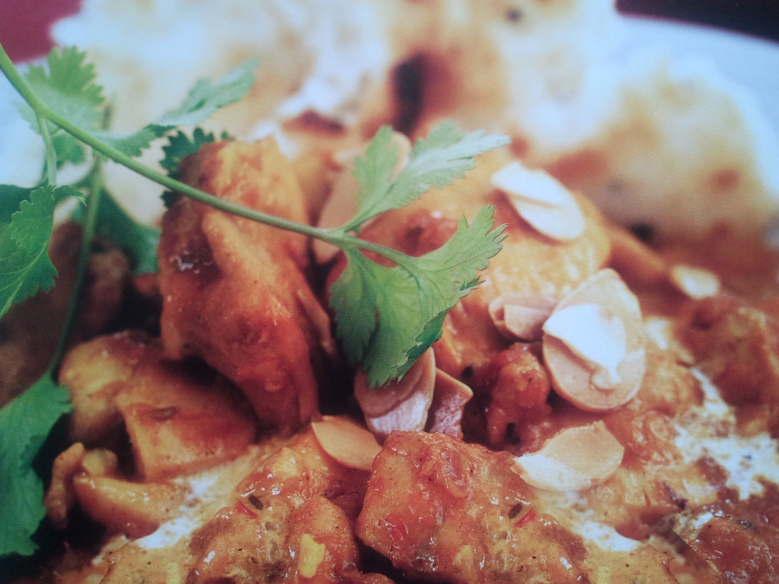 6) Stir in the cream and serve garnished with toasted flaked almonds, sprigs of coriander, and plain steamed rice and/or warm naan bread.