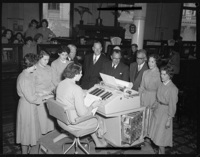 [Image: Members of the staff of the Bank of New Zealand, on Lambton and Customhouse Quays, Wellington, gather around the first electronic book-keeping machine installed in the bank, 1960. HT: National Library of New Zealand]